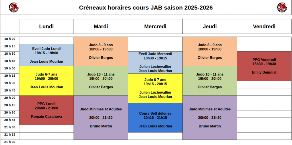 Ci dessous les horaires des cours pour la saison 2025 / 2026 :
